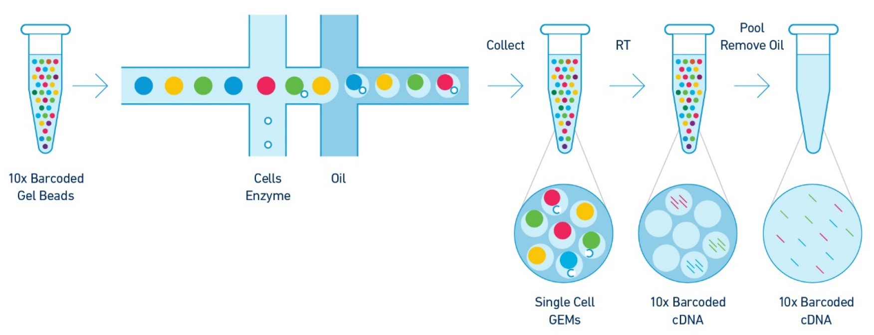 Upon dissolution of the Single Cell 3' Gel Bead in a GEM, primers containing (i) an Illumina R1 sequence (read 1 sequencing primer), (ii) a 16 bp 10x Barcode, (iii) a 10 bp randomer-UMI and (iv) a poly-dT primer sequence are released and mixed with cell lysate and Master Mix. Incubation of the GEMs then produces barcoded, full- length cDNA from poly-adenylated mRNA. After incubation, the GEMs are broken, and the pooled fractions are recovered. Libraries are generated and sequenced from the cDNA and the 10x Barcodes are used to associate individual reads back to the individual partitions. See figure below: