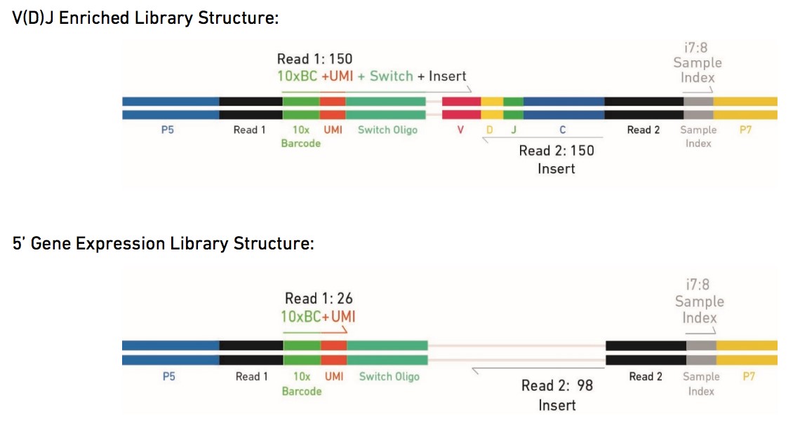 The Single Cell V(D)J Solutions produce V(D)J enriched and 5' gene expression Illumina-ready sequencing libraries. A library comprises standard Illumina paired-end constructs which begin and end with P5 and P7. For V(D)J enriched libraries, Read-1 encodes the 16 bp 10x Barcode, 10 bp UMI, and 13 bp Switch Oligo, as well as the 5' end of an enriched transcript. For 5' gene expression libraries, Read-1 encodes the 16 bp 10x Barcode and 10 bp UMI. Due to Enzymatic Fragmentation, for both libraries Read-2 encodes a random internal fragment of the corresponding insert. Sample index sequences are incorporated as the i7 index read. See picture below: